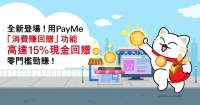 PayMe推消費賺回贈平台 現金回贈最高15% PayMe by HSBC推出「消費賺回贈」平台,讓用戶於日常購物中輕鬆「賺多啲」,用戶只需更新至最新版本,便可在應用程...全文 今日15:13 | 香港財經