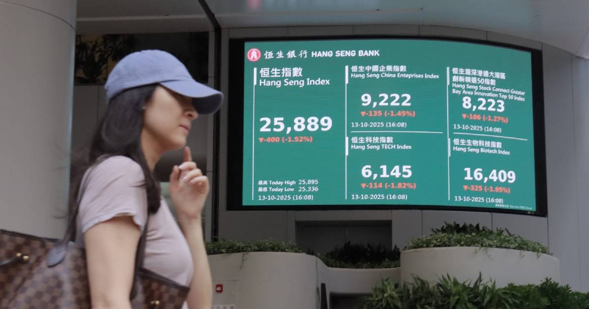 中美關係急轉緊張,美國下月1日起對中國貨加徵100%關稅,港股承接連跌5日的走勢,恒指甫開市即跌穿兩萬六關口及50天線(現處25803),一度最多挫逾900點,部分大型藍籌股午市有買盤,大市跌勢回順,全日跌幅最終收窄至400點,六連跌,累瀉1397點或5.12%,險守50天線。