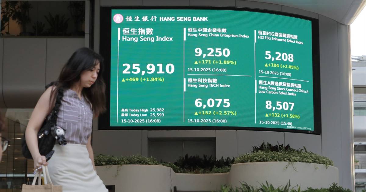 恒指高開273點,報25714點,其後升幅曾收窄至152點,低見25593後升幅逐步擴大,科技股有買盤,大市一度最多上揚540點,逼近兩萬六關口,高見25982後回順,全日收報25910點,升469點或1.84%,重返50天線。