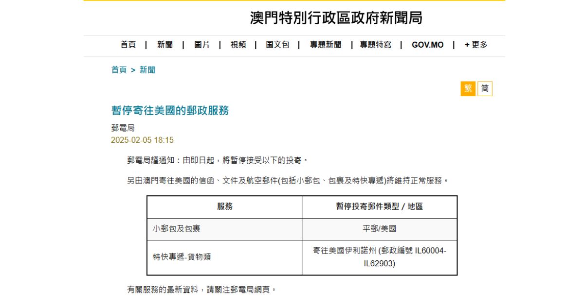 澳門暫停平郵往美國小郵包及包裹服務 2025年2月5日 澳門郵電局宣布,由即日起暫停接受平郵往美國的小郵包及包裹的投寄。另由澳門寄往美國的信函、文件及航空郵件(小郵包、包裹及特快專遞),將維持正常服務。