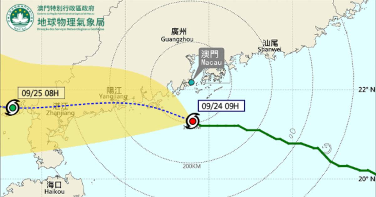 早上9時,「樺加沙」正集結在澳門南約100公里處,以時速約20公里向西北偏西方向移動,正逐漸接近澳門。