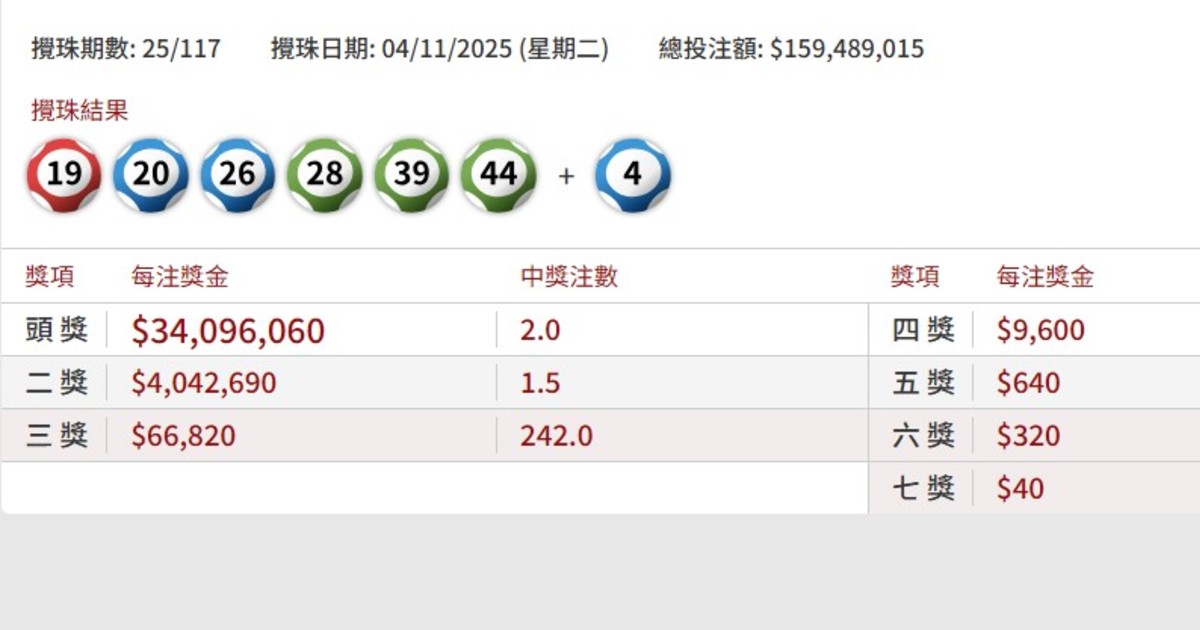 六合彩結果丨幸運二金多寶頭奬兩注中 每注派逾3409萬