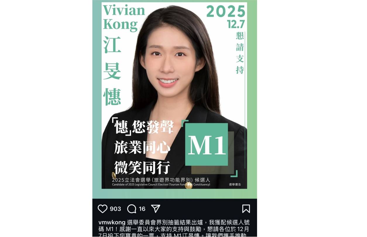 競逐立法會旅遊界的「微笑劍后」江旻憓傍晚在社交平台透露,自己抽到的編號,但在介紹的文字中開篇便說「選舉委員會界別抽籤結果出爐,我獲配候選人號碼M1!」即錯誤地介紹自己為「選舉委員會界別」,而非「旅遊界界別」,相關帖文其後已被刪除。