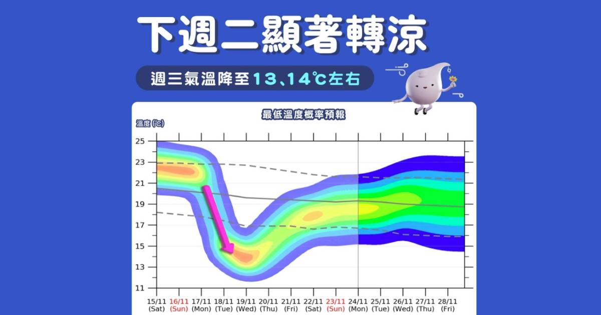 天文台社交平台發文提醒市民,受強烈東北季候風補充影響,預料香港下周一(17日)晚北風逐漸增強,周二顯著轉涼,周三氣溫會下降至13、14度左右。