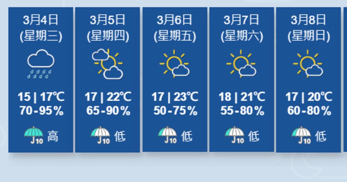 本港今日料天氣清涼,多雲有雨,稍後雨勢逐漸減弱。日間氣溫徘徊在17度左右。吹和緩北至東北風,風勢間中清勁。展望未來一兩日早上仍然清涼,天色逐漸好轉。接近周末日間乾燥。周末期間風勢頗大。