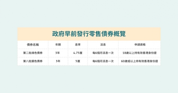 至於銀債系列,在2016年起針對長者「銀髮族」而推出的零售債券,認購年齡為年滿65歲的香港居民,債券年期亦為3年,及每6個月支付利息一次,利息與綜合消費物價指數計算的平均按年通脹率掛鈎,並設有最低息率。直至2021年,合資格認購年齡降至60歲。去年發行第8批銀債定息率更調高至5厘,為歷來最高。不過,要注意的是,銀債是不設二手市場,流通性低,若想提早套現,可賣回給政府。倘以1萬元入場,債券年期3年,持至到期日即2026年計,即一手可獲派利息1500元。「老友記」要注意,現時銀行提供的1年期港元定期存款年利率普遍約3厘,倘新一批銀債息高於有關水平,不妨考慮認購。