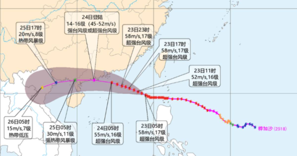中央氣象台:樺加沙料明中午到晚上珠海到湛江一帶登陸