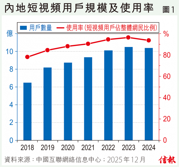 內地短視頻行業近年蓬勃發展,內容創作者和用戶數量持續增長,市場規模不斷擴大。用戶從2018年的6.48億,增加至2024年的10.4億,使用率也從78.2%,攀至93.8%,連續6年保持網絡視聽應用細分領域第一【圖1】。 ...全文