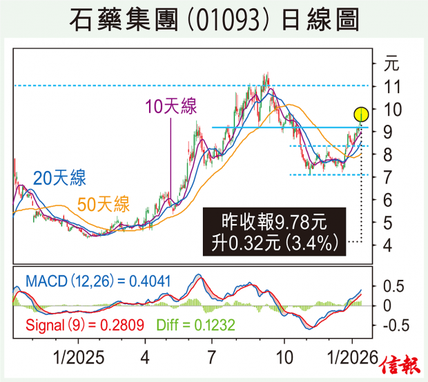 大市再下一城,恒指昨日一度衝擊27000心理關口,收市報26848,升239點。不過昨市高開低收呈陰燭,短線或需整固,預料26500水平會有支持。 逾30產品處註冊臨床階段 石藥集團(01093)昨升3.38%報9.78元,集團開發...全文
