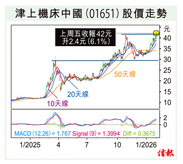 港股上周五大幅下挫,恒指收報27387點,大跌580點。美國總統特朗普提名視為「鷹派」的沃什為下任聯儲局主席,此君主張大舉縮表,市場擔心會導致美債息率急升,不利股市。 津上機床中國(01651,下稱津上機床)逆市上升6%,收報42元,創52周新高。本欄去年11月曾作推介,40元目...全文