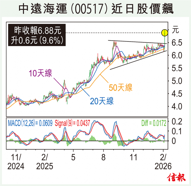 大市延續反彈,恒指昨天收報26847點,升12點,兩日反彈僅累升71點,彈力顯然不足,不過陰陽燭連日出現錘頭、陀螺,反映低位有承接,短期或重現拉鋸局面。 中國造船業雄視世界,克拉克森最近發布的數據顯示,去年全球新船訂單2493艘,中國船廠接單1512艘,佔比高達60.65%;以噸...全文