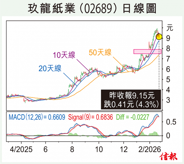 大市回升,恒指昨日收報26765,升175點,但陰陽燭只是十字星,好淡爭持,缺乏明確方向,預料短期會在26300至27000之間反覆。 玖龍紙業(02689)逆市跌4.3%報9.15元。公司市後公布2026財政年度中期業績(截至去年12月底止)。玖紙過去大半年升幅頗大,看來有不少...全文