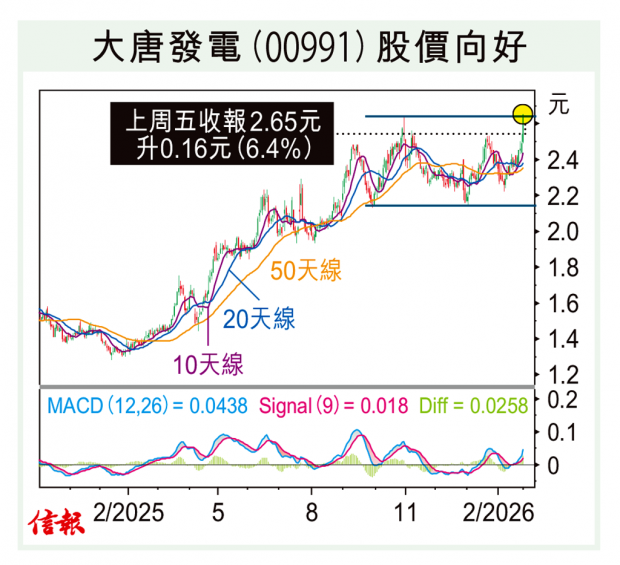 大市上周五反彈,恒指收報26630點,升249點,一周累漲214點,2月份則跌756點,依然是橫行市,26200屬短線支持,若確認跌破,可能要再探橫行區底部25000點。 電力股上周五強勢,華能(00902)和大唐發電(00991)均升逾6%。多家券商認為,電力板塊近期走勢強勁,...全文