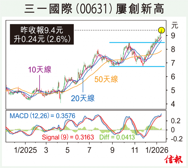 大市連漲4日,恒指昨日收報26999點,升151點,成交金額增至3403.9億元,陰陽燭於阻力前接連出現陀螺和十字星,短線或有整固,但資金已到位,估計整固後會挑戰27500關口,有望打破數月來的橫行局面。 三一國際(00631)股價近期相當強勢,屢創52周新高,昨日再漲2.6%報...全文