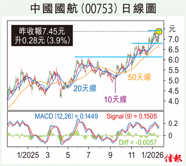 港股反覆偏軟,恒指昨日曾升75點,最多跌200點,收市報26487點,挫76點,島形頂威脅仍在,提防恒指破頂不成回復橫行走勢,或再次下探橫行區底部25000點水平。 中資航空股昨日齊飛,去年10月下旬建議收集的中國國航(00753)昨漲3.9%,收報7.45元,升越7.4元目標。...全文
