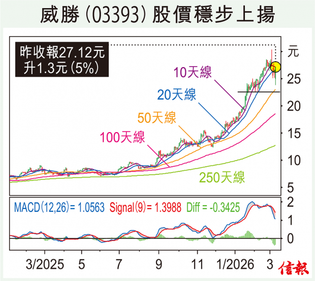 大市昨日下挫,恒指收報27032,跌233點,結束三連升。港股處於上落市,升唔上就要回,20天線(26967)有初步支持,50天線(26382)貼近100天線(26309),料有強大支持。 攜手研腫瘤免疫領域藥物 生物科技股近期股價...全文