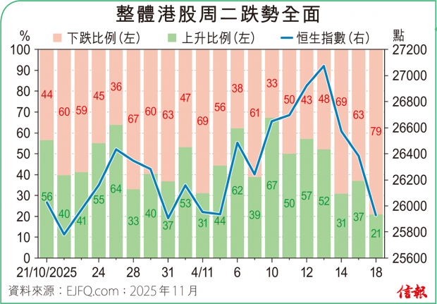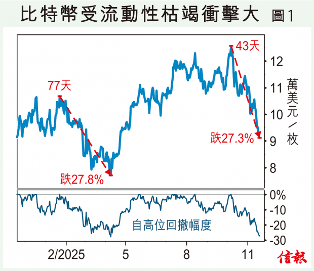 環球股市昨日一片紅,過去一段時間升得愈多的股市跌得愈勁,日經及南韓KOSPI均跌逾3%,恒指挫1.7%算溫和。其他市場如比特幣一度失守9萬美元水平,而且,自10月6日見頂後,累積跌幅達27.3%,這一波跌幅比得上今年3至4月間關稅不明朗觸發的大跌市【圖1】。不論是股市或是加密貨幣下跌,背後均是...全文