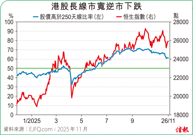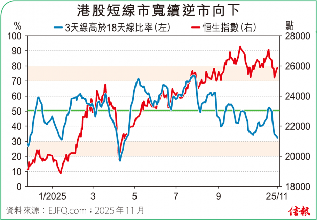 期指結算日港股仍缺方向,恒指昨輕微高開不久即倒跌123點,其後反彈至最多上漲196點,尾段爭持,埋單報25945點,僅升17點,勉強守住10天線,卻連續3日兩萬六點得而復失。11月份再攻27000點不果,暫保39點進賬,能否扭轉10月份下挫勢頭,還看今天。 恒生科技指數11月份則...全文