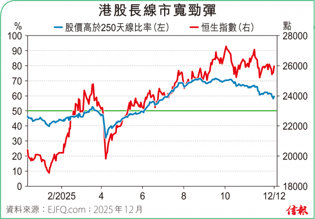 中央經濟工作會議暗示明年貨幣政策放鬆或會加快,加上外圍股市向好,帶動港股從逾兩星期低位急彈;惟全星期計,恒指仍要跌109點(0.42%),上周五(12日)收報25976點,終止連續兩周升勢。89隻恒指成份股有62隻錄得按...全文