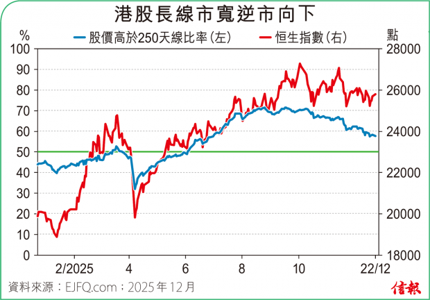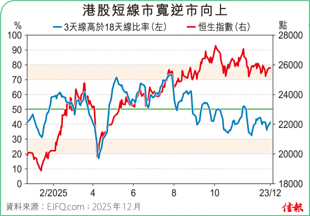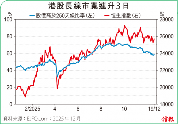 聖誕及新年假期漸近,港股波幅進一步縮窄,恒指周五高低位僅相差約200點,是10月底以來最細,埋單升192點,報25690點,3日共漲455點(1.8%),但繼續受制50天線。 A股情況相若,滬深300指數過去一星期處50天線下運行,收報4568點,2025年迄今累飆16.09%,...全文