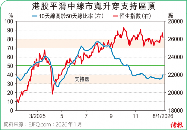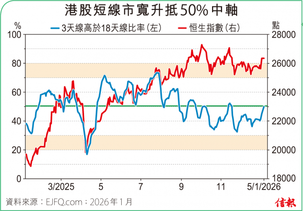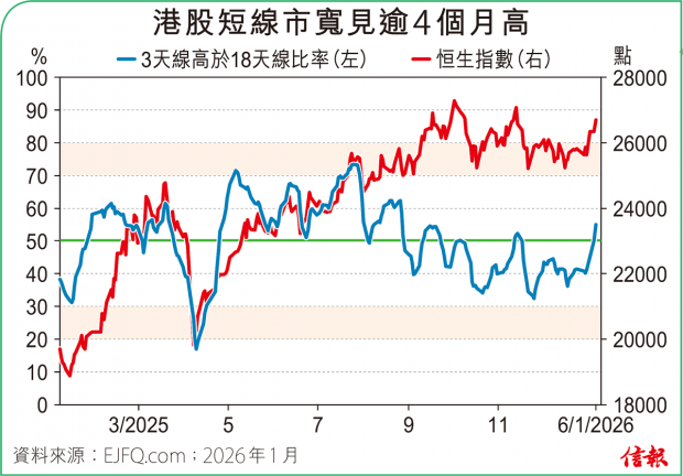 承接華爾街道指破頂強勢,港股昨裂口高開155點後一度進賬510點,觸及去年11月13日以來最高的26858點才回順,埋單上漲363點,報26710點,甫踏入2026年便實現「三連捷」共飆1080點或4.21%。技術上,恒指明顯升越25600點至26500點的一年累積最大型成交量密集區,下一個阻...全文