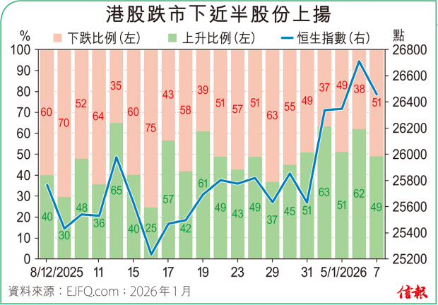 美國道指與標普500指數周三(7日)齊刷歷史高位後倒跌收市,拖累港股昨低開156點,一度下滑至25960點,埋單挫309點,報26149點。 恒指兩萬六關失而復得,2026年以來進賬縮至2.02%,明顯不及區內的南韓股市。KOSPI指數昨再創紀錄高位,收報4522點,今年頭5個交...全文