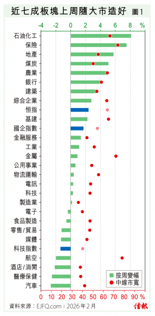 外圍股市造好,港股在1月最後一星期發力,惟科技股弱勢未除,拖累恒指二萬八關得而復失,上周五(30日)收報27387點,全星期計算,勁漲638點(2.38%),88隻藍籌股58隻按周上揚,工業股熱炒,信義玻璃(00868)...全文