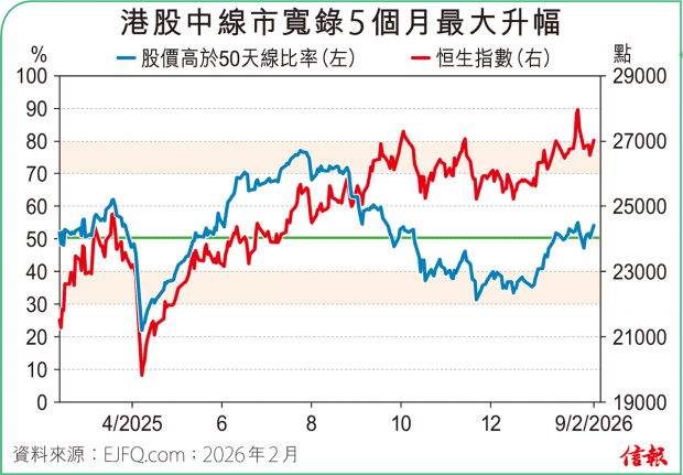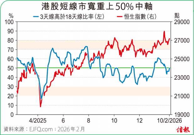 ❶大市表現 恒指高開後重越10天線,收報27183點,升155點(0.58%)。主板成交金額減至2340.4億元,全日沽空金額344.19億元,沽空比率回升至14.71%。整體2600多隻港股升跌比例56:44。3天線高於18天線、股價高於50天...全文