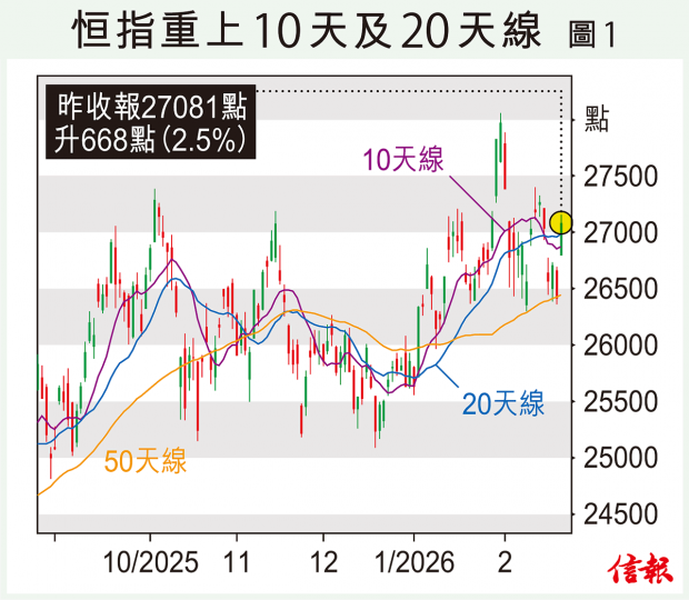 港股丙午馬年首日見紅後昨反撲,恒指高開385點,早段顯著抽升,兩萬七點關迅即收復,一度攀上27156點,飆742點,埋單漲幅縮至668點,報27081點,主板成交金額在缺乏北水下約1730億元。 科網股回勇屬升市重要推動力,科指曾彈逾4%,收市仍上揚3.34%,惟早前7個交易日分...全文