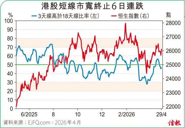 4月份來到尾聲,華爾街繼續破頂,港股仍乏起色。恒指昨甫開市便跌穿50天線,最多下瀉316點,埋單挫245點,報25679點,隨着20天線也告失守,14天RSI中軸不保,後市很大機會下試4月8日遺留的上升裂口,亦即「牛熊分界」250天線約25400點位置。 除了技術走勢轉弱,抽水潮...全文
