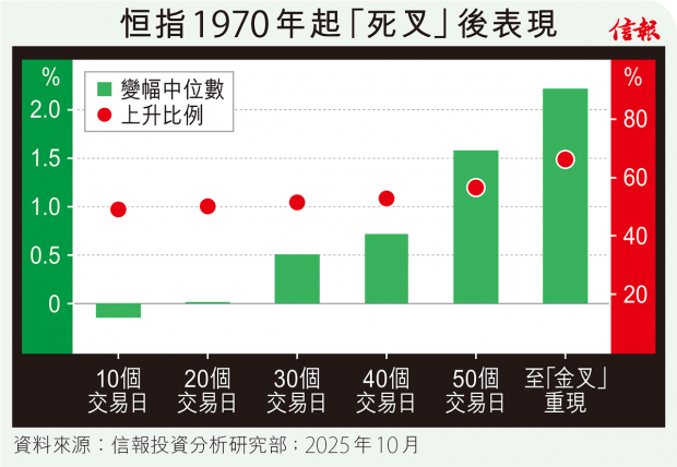 港股昨在兩萬六關波動,最多挫190點才反撲,一度漲近300點,埋單報25967點,僅進賬186點。科指同樣微升,收報5951點,10天線與50天線差距繼續縮窄,快將步恒指後塵,形成死亡交叉(下簡稱「死叉」)。 恒指10月初攀至超過4年高位27381點便回落,10天線不久從升轉跌,...全文