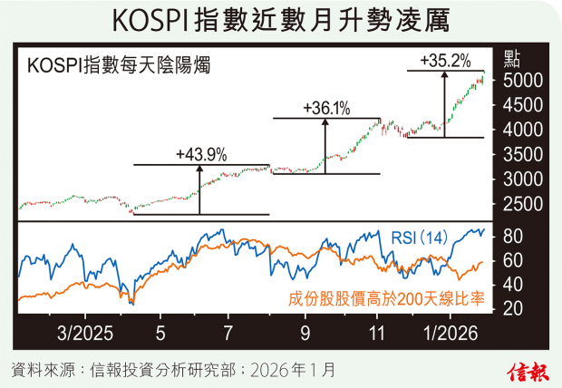港股周二收於兩萬七後昨一鼓作氣爆上,恒指埋單飆699點,報27826點,屬近5年高位,2026年迄今進賬增至2196點或8.57%,惟跟領跑全球的「韓牛」比較,相形見絀。 南韓KOSPI指數去年急漲75.6%,是環球股指之冠,踏入2026年一樣凌厲,開局已再度破頂,合共19個交易...全文