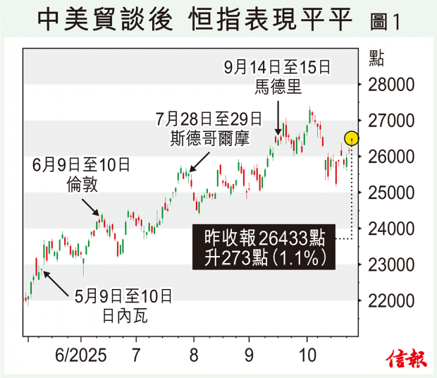 中美上周末在馬來西亞達成貿易框架協議,等待兩國元首確認,令本周四舉行的「習特會」更形重要,今次談判應該會比之前舉行的四輪談判更具成果。然而,恒指昨天升幅僅1%,反映投資者仍然較為審慎,這或許與周三重陽節假期在即有關。加上,過去四輪談判股市都是提前反映,會談完結後升幅有限【圖1】,更多是趁好消息...全文