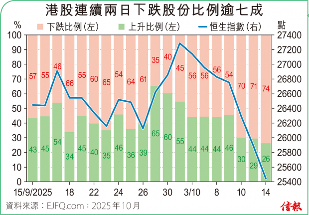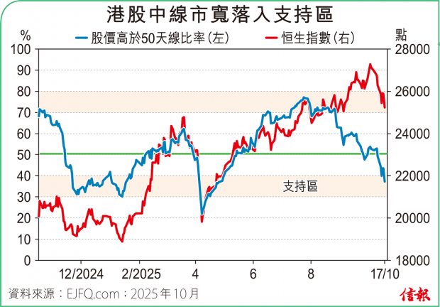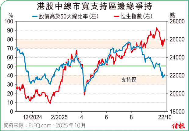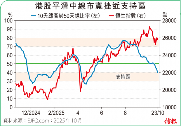 ❶大市表現 恒指低開早段最多瀉373點,收報25781點,挫245點(0.94%),50天線失守。主板成交金額減至2275.36億元,全日沽空金額338.51億元,沽空比率回升至14.88%。整體2600多隻港股升跌比例40:60。3天線高於18...全文