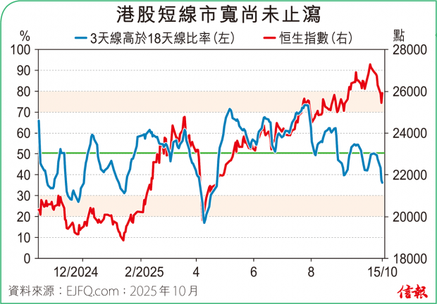 ❶大市表現 恒指高開不久即倒跌尋底,收報25441點,挫448點(1.73%)。成交金額減至3989.1億元,全日沽空金額630.87億元,沽空比率稍降至15.81%。整體2600多隻港股升跌比例26:74。3天線高於18天線、股價高於50天線、...全文