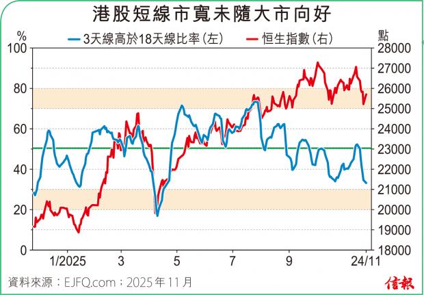 ❶大市表現 恒指高開曾重返26000點,惟收市倒跌99點(0.38%),報25830點。主板成交金額減至2114.26億元,沽空金額418.8億元,沽空比率升至19.81%。整體2600多隻港股升跌比例42:58。3天線高於18天線、股價高於50...全文