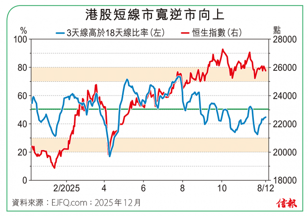 ❶大市表現 恒指高開後續於20天線位置徘徊,收報26095點,微升61點(0.24%)。主板成交金額縮減至1782.47億元,全日沽空金額273.8億元,沽空比率稍降至15.36%。整體2600多隻港股升跌比例49:51。3天線高於18天線、股價...全文