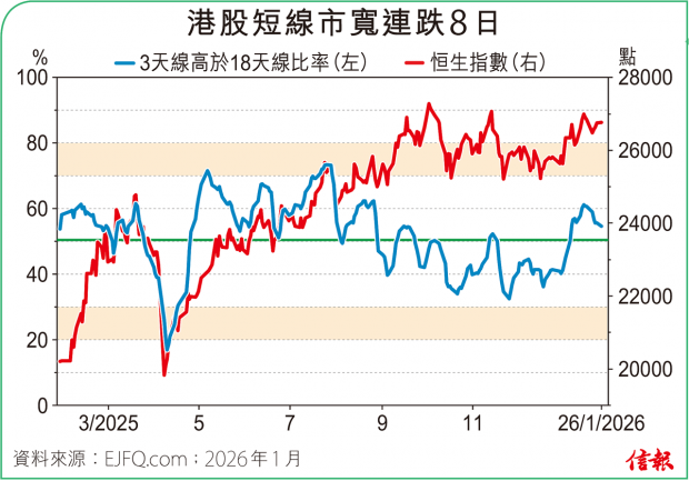 ❶大市表現 恒指低開後爭持,尾市好轉,收市倒升97點(0.37%),收報26585點。主板成交金額增至2504.51億元,全日沽空金額414.76億元,沽空比率續升至16.56%。整體2600多隻港股升跌比例51:49。3天線高於18天線、股價高...全文