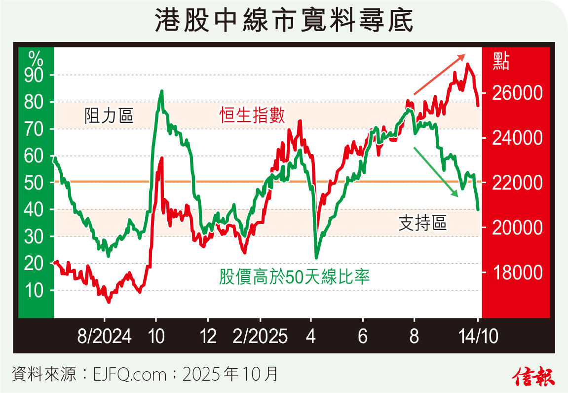附【圖】所示,港股中線市寬(股價高於50天線比率)早在7月時攀上超買區頂後掉頭下滑,與恒指數月來呈熊背馳尚沒完全獲得修正,至上周五終跌穿50%中軸,預告市況有可能進一步探底,根據近年3次較大型調整浪的規律,該市寬往往需要回落至30%到40%支持區(甚或更低),恒指才喘穩並重拾漲勢。