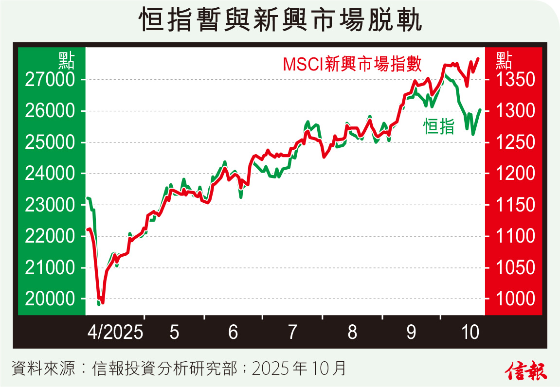 值得留意的是,海外投資者對新興股市興趣也日漸轉濃,包含港股在內的MSCI新興市場指數周一曾觸及1384點,屬2021年6月15日後高位,收報1383點,2025年至今暫漲28.62%,表現遠勝MSCI世界指數和標普500指數的18.35%與14.51%,顯示中美貿易摩擦延續並未窒礙資金流向新興市場資產的進度,這對港股而言肯定利多於弊。