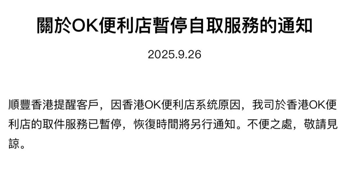 順豐:OK便利店取件服務暫停