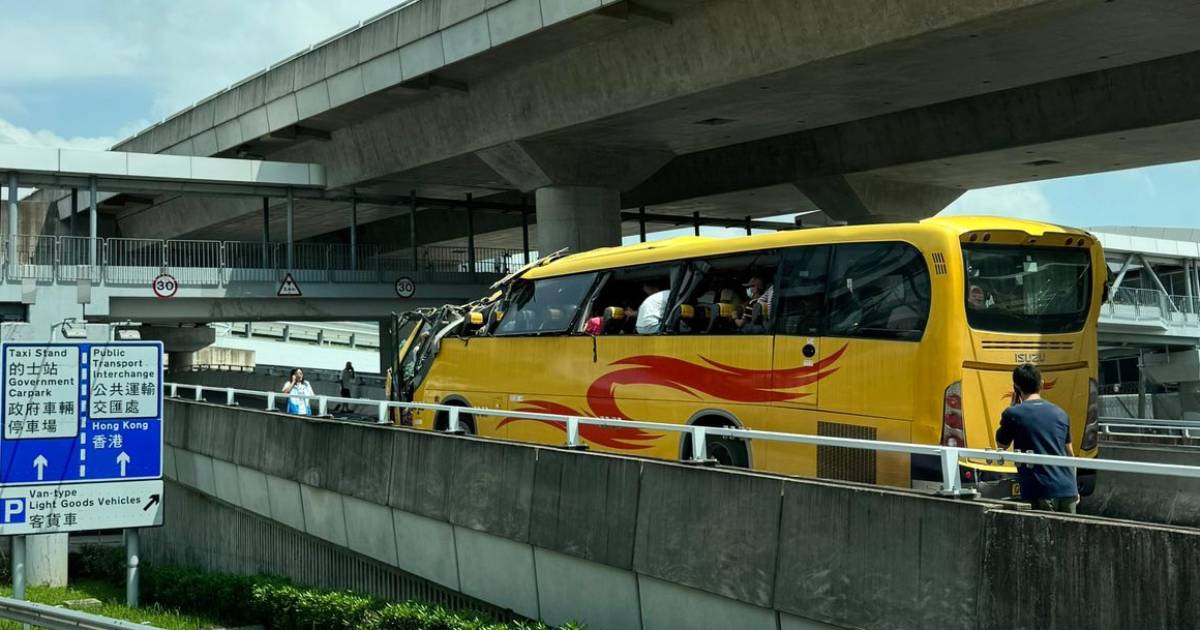 一輛旅遊巴中午在香園圍管制站對開撞到天橋底高度限制位置,至少11名乘客受傷。