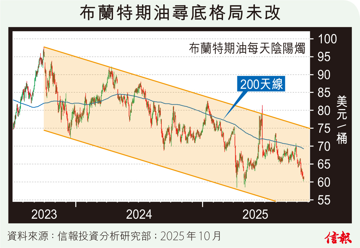 第四季名副其實屬油市淡季。據2000年至今近四分一世紀資料,布蘭特期油於第四季跌多升少,拉勻下挫4.25%,是唯一見紅季度,首三季各漲6.73%、10.2%、0.65%;如果統計按月表現,同期10月份平均下滑1.93%,在全年12個月中排尾二,最差正是緊接而至的11月(瀉2.4%)。油價踏入10月後反覆下行,上周五收報每桶61.29美元,為2025年以來第二低,10月迄今插約9%,假若油市跟往年周期特性相似,估計短線不易大幅回勇。